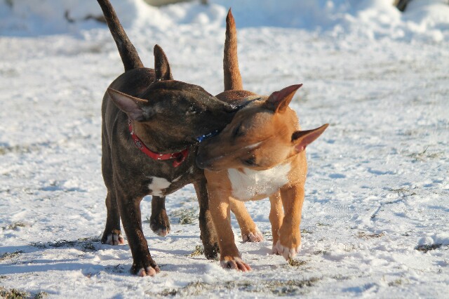 Минибульки очень активные собаки, очень любящие движуху. Конечно собакам веселее в компании себе подобных, когда есть с кем играть, то прогулки всегда активные. В мороз, мы гуляли даже без одежды, но не уходили далеко от дома. Если у нас планируется длинная по километражу прогулка, миников обязательно одеваю.